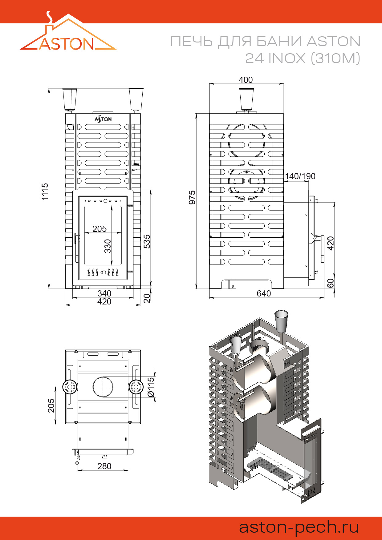 Банная печь Aston 24 Inox (310М) со стеклянной дверцей из стали модели 310М. Данная печь выполнена в виде топочного агрегата с двумя закрытыми каменками в форме сплошной невентилируемой трубы, размещенной перпендикулярно корпусу основного изделия. Поверх топочного агрегата навешивается съемный сетчатый кожух, формирующий открытую каменку, которая экранирует топочный агрегат, препятствуя распространению инфракрасного излучения. Подача воды в закрытую каменку производится через воронки в верхней части печи.