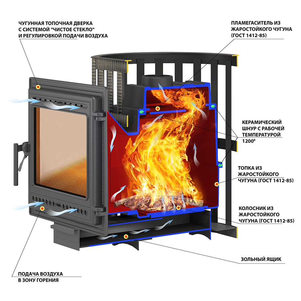 Печи модельного ряда Легенда от компании Везувий это модельный ряд базовых чугунных печей-сеток. Данная печь укомплектована чугунной дверцей со стеклом каминного типа (модели 505) и чугунным колосником. В конструкции печи предусмотрен газоходный канал, огибающий отсекатель пламени и способствующий эффективному нагреву каменки. Кожух-сетка данной печи имеет элементы ковки.