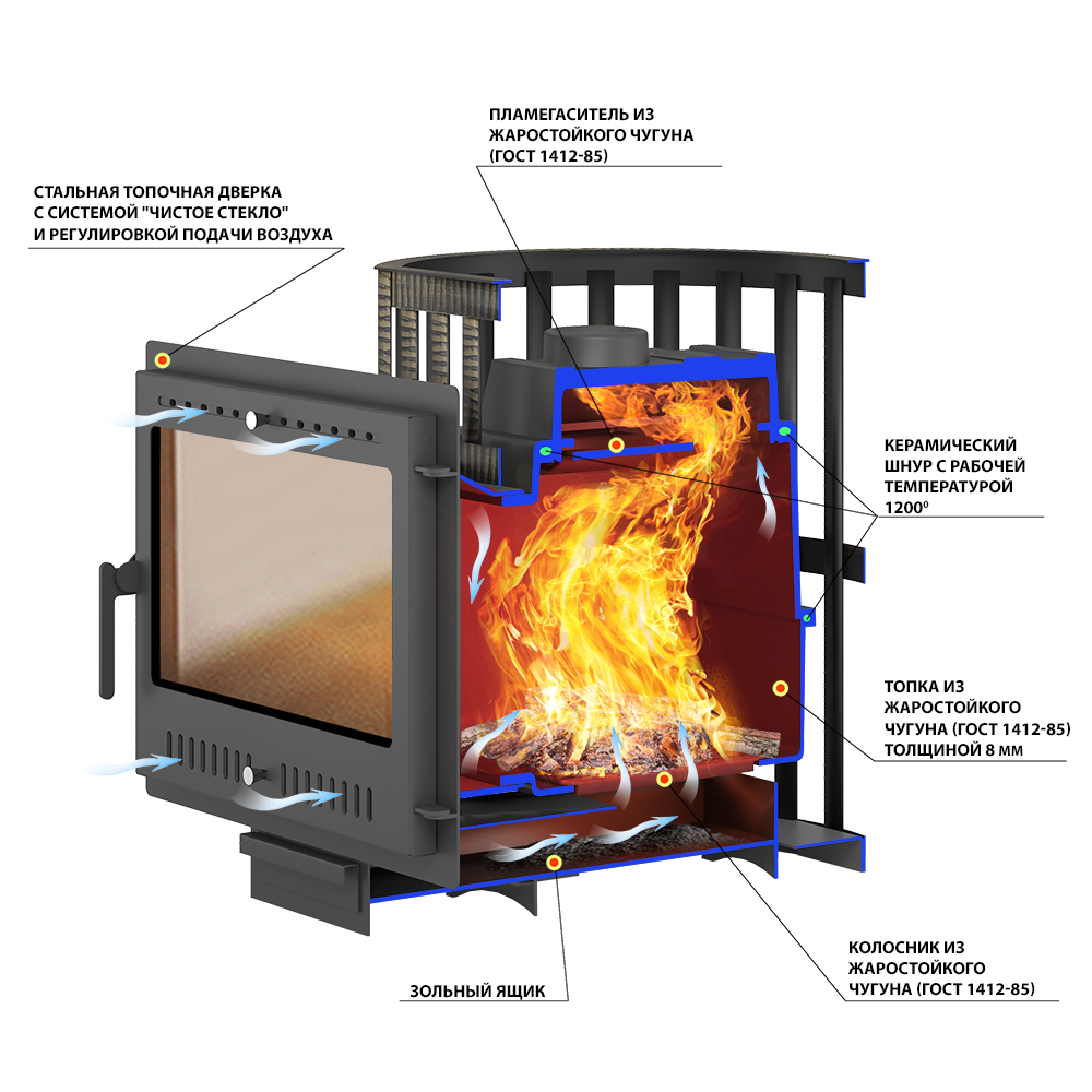 Печи модельного ряда Легенда от компании Везувий это модельный ряд базовых чугунных печей-сеток. Данная печь укомплектована дверцей панорамного типа со стеклом и чугунным колосником. В конструкции печи предусмотрен газоходный канал, огибающий отсекатель пламени и способствующий эффективному нагреву каменки. Кожух-сетка данной печи имеет элементы ковки.