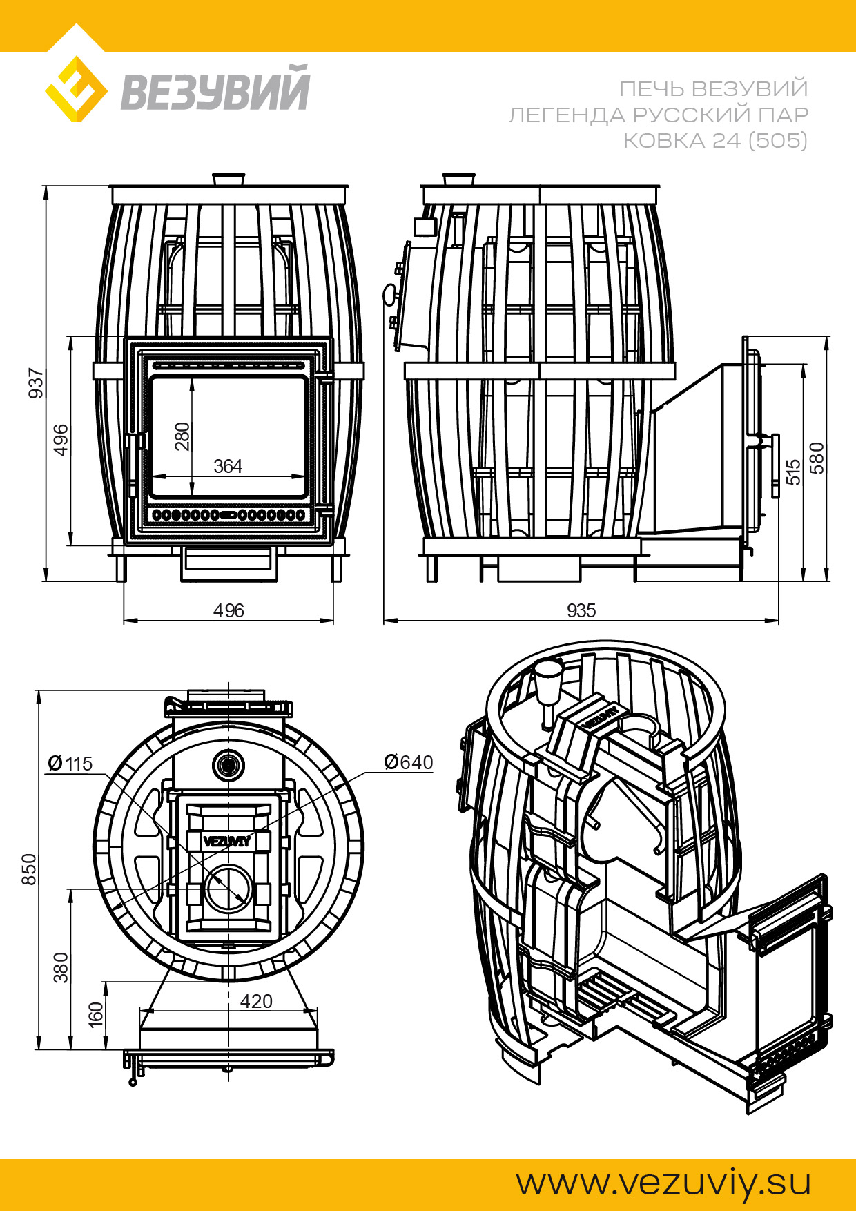 Печи модельного ряда Легенда Русский Пар от компании Везувий это новый модельный ряд чугунных печей, сочетающих в себе долговечность чугунной топки и закрытую каменку, позволяющую получать мелкодисперсный пар. Печи Русский Пар выполнены из толстостенного чугуна, вмещают значительное количество камней и могут долгое время хранить тепло, однако требуют значительного времени для подготовки бани и нагрева всей массы камней. Печь укомплектована чугунной дверцей с панорамным стеклом (модели 505) и чугунным колосником. Для получения мелкодисперсного пара печь оборудована закрытой каменкой. Закрытая каменка выполнена в виде цельного короба из нержавеющей стали, размещенного в корпусе печи и прогреваемого круговым потоком пламени. Вода в закрытую каменку подается через заливную воронку.