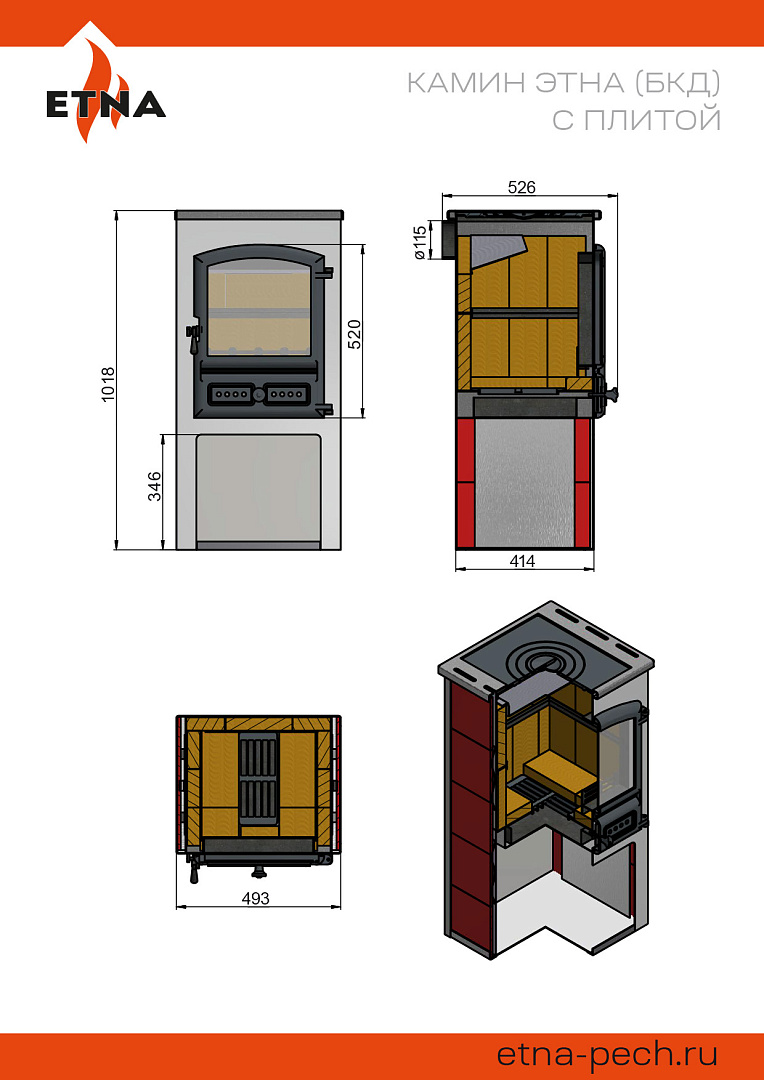 Печь-камин Этна (БКД) с плитой от компании Этна. Камин выполнен в пристенном варианте, укомплектован большой каминной дверкой со стеклом. Топка камина выполнена из конструкционной стали, в топке установлен отбойник из нержавеющей стали. Камин облицован плиткой из натурального камня амфиболита. Камин оборудован чугунной плитой и имеет выход дымохода назад, патрубок дымохода 115 миллиметров.