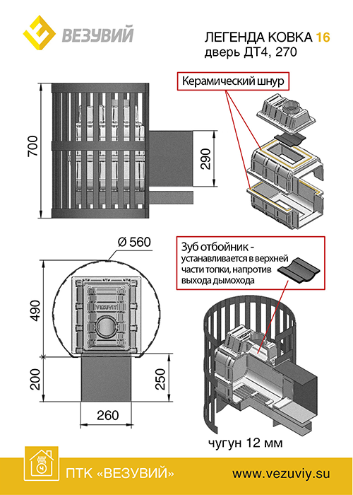 Печи модельного ряда Легенда от компании Везувий это модельный ряд базовых чугунных печей-сеток. Данная печь укомплектована чугунной глухой дверцей (модель 271) и чугунным колосником. В конструкции печи предусмотрен газоходный канал, огибающий отсекатель пламени и способствующий эффективному нагреву каменки. Кожух-сетка данной печи имеет элементы ковки.