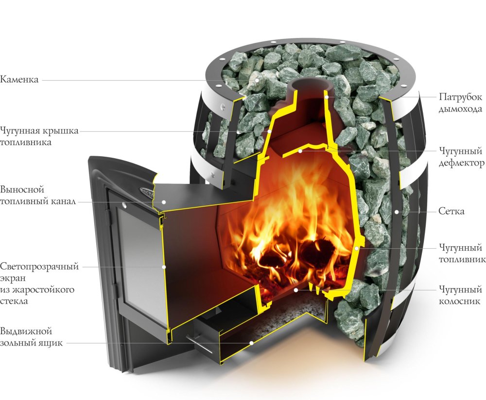 Саяны Cast - банная печь от компании TMF, модель чугунной печи на базе печи-сетки модели Саяны. Печь рассчитана на работу в парильном помещении объемом от 8 до 18 куб. метров. Чугунная топка данной печи заключена в сетчатом стальном кожухе. Кожух вмещает большое количество камней, которые экранируют излучение топки и позволяет создавать в парной качественный микроклимат. Чугунная печь долго держит накопленное тепло и равномерно отдает его парильному помещению.