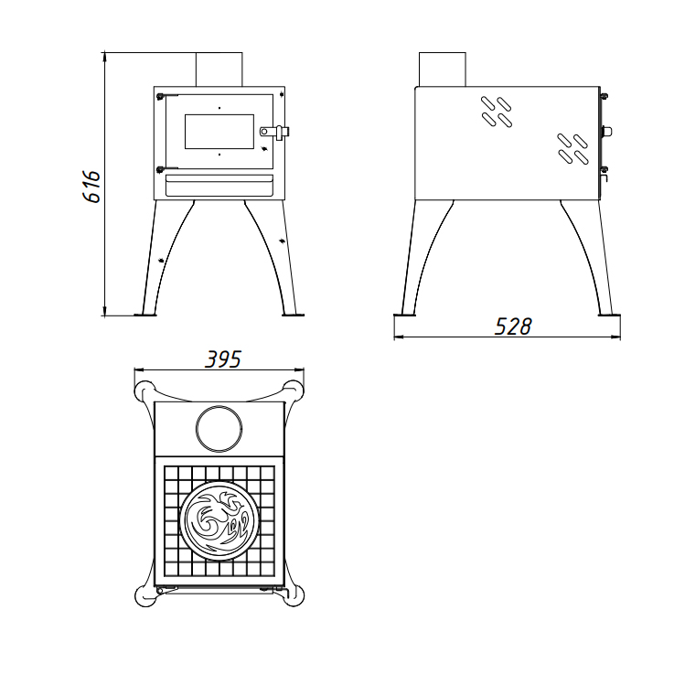Печь-камин Кельн турбо с плитой от компании ЭкоКамин. Топочная часть выполнена из листовой стали, в верхней части печи размещена съемная плита, при снятой плите печь можно использовать в качестве мангала. Печь имеет выход дымохода вверх.