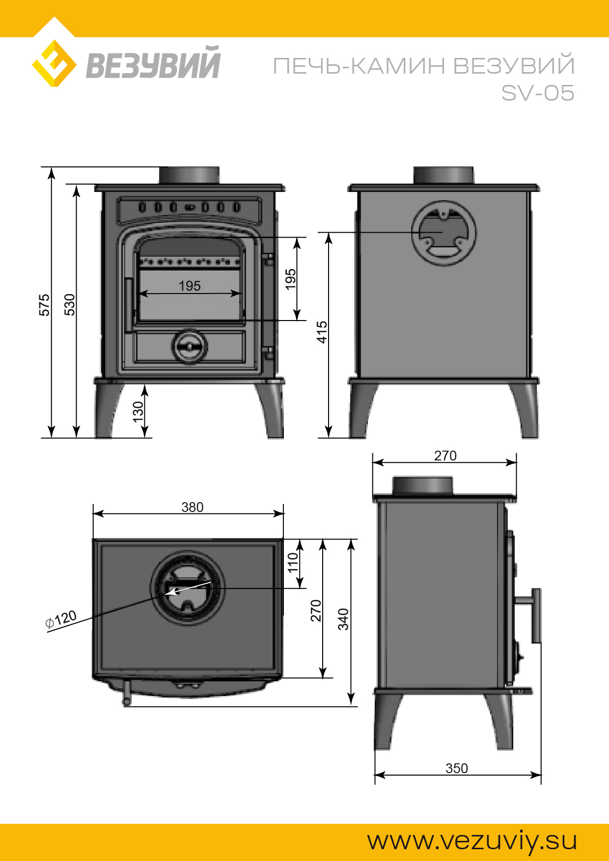 Печь-камин Везувий SV-05 Антрацит от компании Везувий. Камин выполнен из чугуна в пристенном варианте, укомплектован небольшой дверкой со стеклом. Камин имеет универсальный выход дымохода вверх или назад по желанию потребителя, патрубок дымохода 120 миллиметров. Камин окрашен в черный цвет.