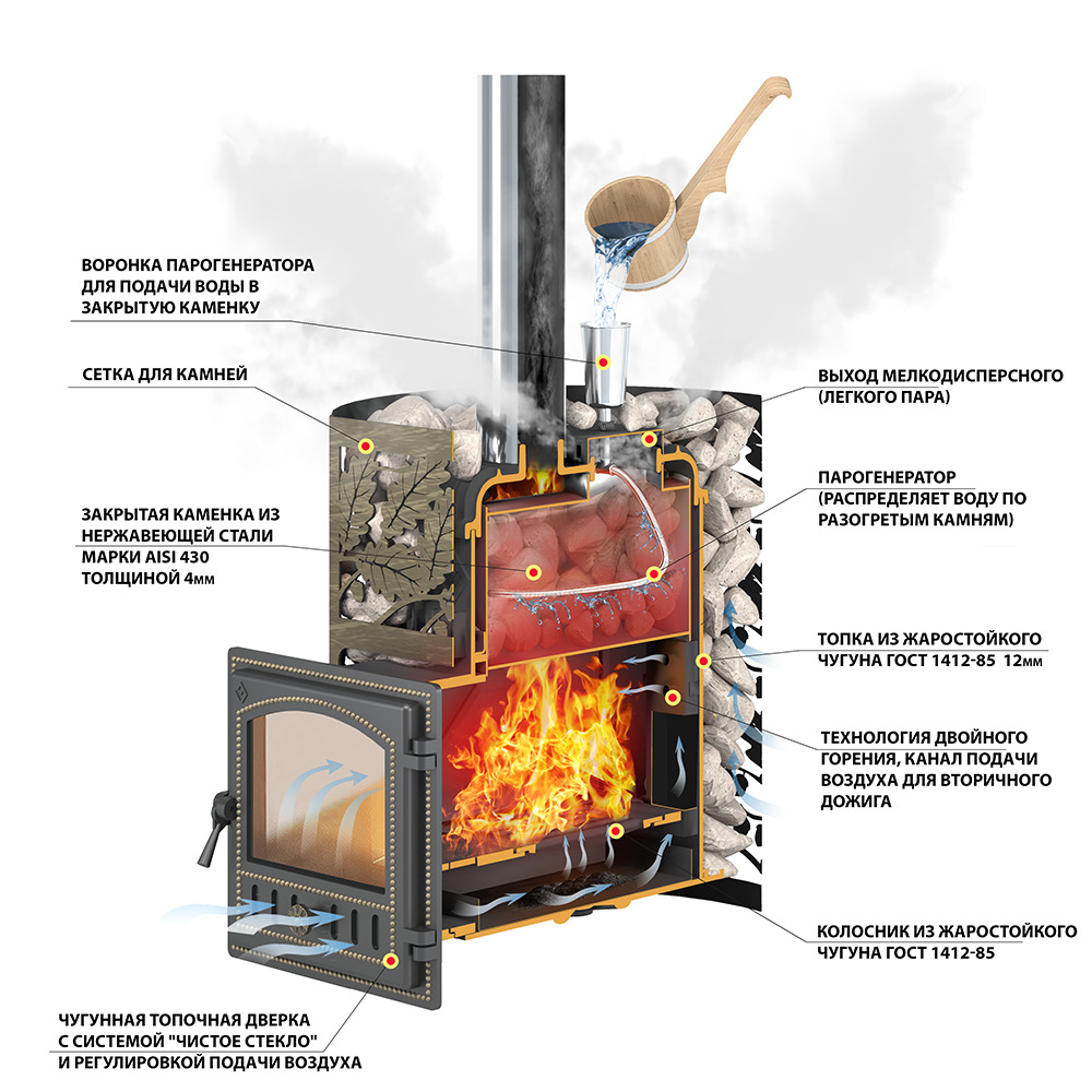 Печи модельного ряда Эверест от компании Везувий это модельный ряд чугунных печей сборной конструкции. Данная печь укомплектована чугунной дверцей со стеклом (модели 280) и регулируемым поддувалом, а также чугунным колосником. В конструкции печи предусмотрен газоходный канал, огибающий отсекатель пламени и способствующий эффективному нагреву каменки. В конструкцию внутренней части топки также включен элемент для подачи воздуха в верхнюю часть топочной камеры и обеспечивающий тем самым более эффективное дожигание продуктов горения. В отличие от печей Эверест с открытой чугунной верхней каменкой в данной модели каменка выполнена в виде вставки из нержавеющей стали и закрыта чугунной пластиной, формирующей верхнюю крышку печи. Для подачи воды внутрь закрытой каменки на верхней крышке печи размещена заливная воронка.